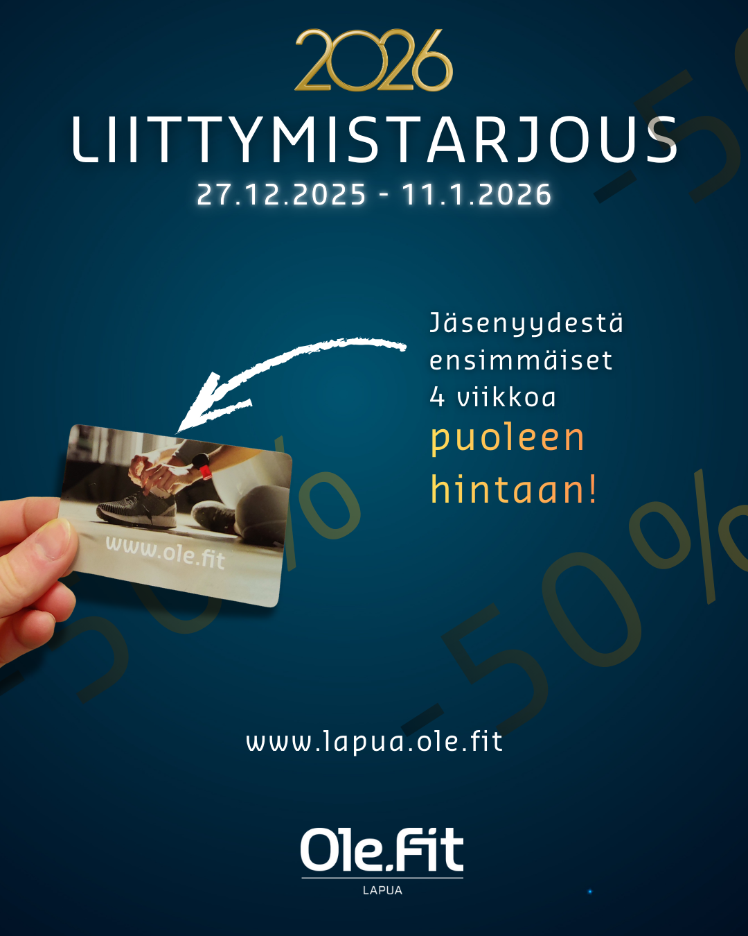 Tarjousjakson jälkeen jäsenyys jatkuu normaalihintaisena (valitse Kuntosali + Ryhmäliikunta tai pelkkä Kuntosali) kalenterikuukauden irtisanomisajalla. Tarjousjaksolla ei voi irtisanoutua. Tarjous koskee uusia ja palaavia asiakkaita. Ei voi yhdistää muihin alennuksiin. Tarjous voimassa 11.1.2026 saakka. Ostettavissa verkkokaupasta ja asiakaspalvelusta.