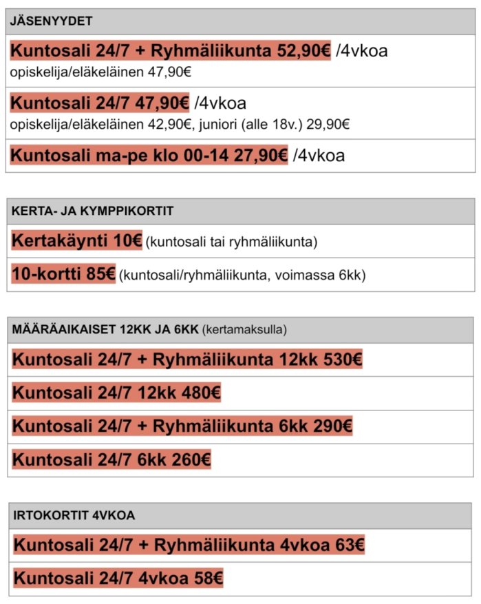 Meillä sitoudut vain liikkumaan! Jäsenyyksissämme on kalenterikuukauden irtisanomisaika, etkä maksa liittymis- tai vuosittaisia kausimaksuja. Tervetuloa kokeilemaan kerran veloituksetta!