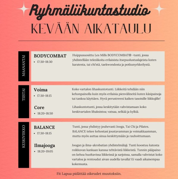 Fit Lapuan ryhmäliikuntastudio tarjoaa monipuolisen tuntivalikoiman erilaisia kehonhuolto- ja muokkaustunteja sekä aerobisia hikitreenejä. Tarjonnasta löytyy maailmallakin suosittuja Les Mills -tunteja sekä Fit Lapuan omia erikoisuuksia.